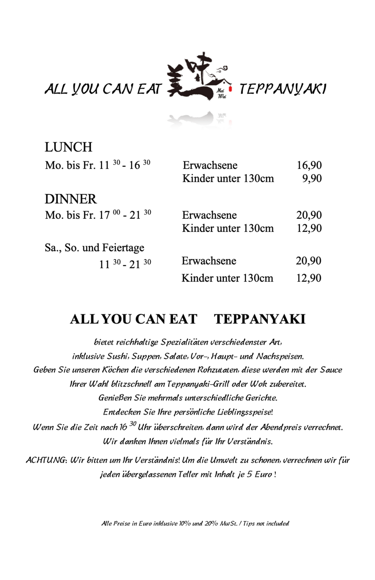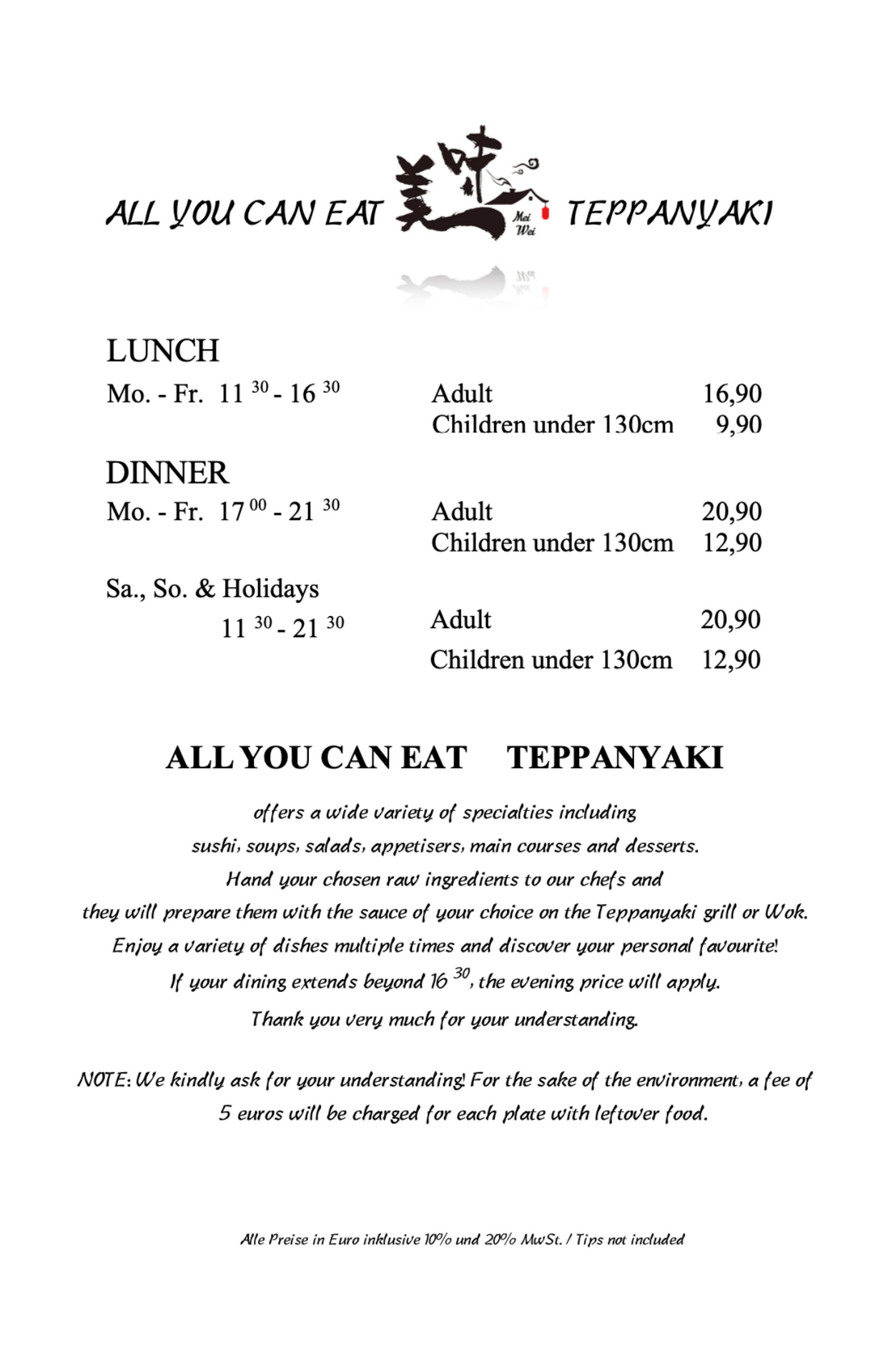 In unserer offenen Teppanyaki-Küche zaubern unsere Köche köstliche Gerichte aus besten Zutaten, während Sie die Atmosphäre genießen.Neben Teppanyaki bieten wir eine große Auswahl an Sushi und weiteren asiatischen Spezialitäten – alles als All-you-can-eat-Erlebnis. Freuen Sie sich auf frischen Geschmack, lebendige Showküche und ein modernes Ambiente. Wir freuen uns darauf, Sie bei MEIWEI VIENNA willkommen zu heißen!